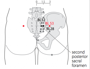 Ou : utiliser les foramens sacraux comme points de repère. V53 Bao Huang se trouve au niveau du 2ème foramen sacral, 3 cun en dehors de la ligne médiane.